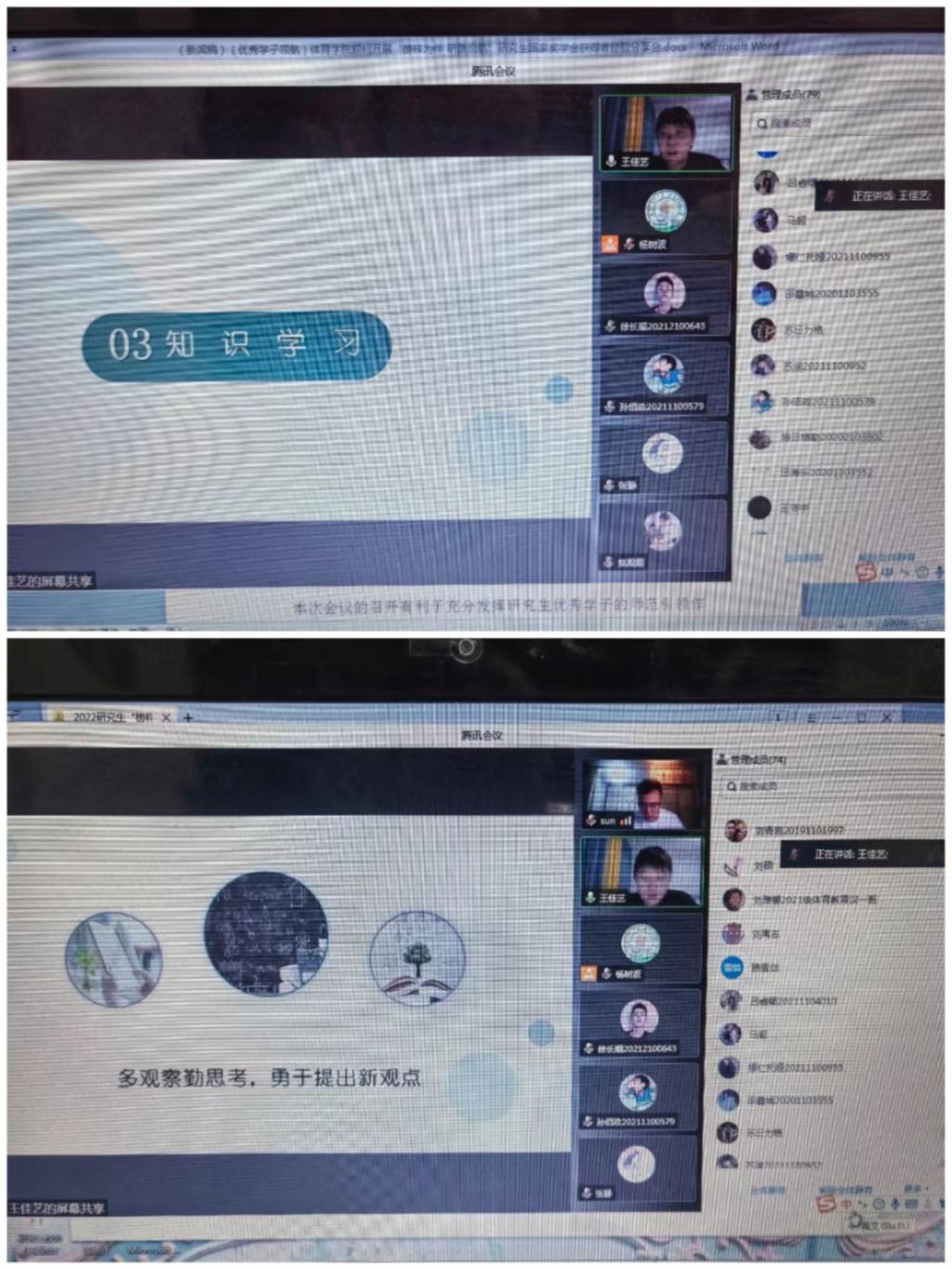 王佳艺同学围绕科研探索、知识学习、寓学于乐分享了科研、学习与生活等方面的心得;智勇同学从热爱、胸怀、实干三个方面并结合自身经历与大家分享了科研、学习、实践学习心得与成长感悟,鼓励师弟师妹们要热爱自己的选择、胸怀体育的发展、勤学实干实现梦想。