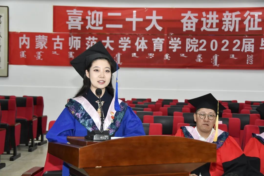 学校学术委员会委员、体育学院院长、博士生导师高娃教授对全体毕业生送上深深祝福和殷殷嘱托:“忆往昔,峥嵘岁月,几度寒暑,夏熟秋实,冬去春来。几年来,你们因体育而相聚,因体育而改变,收获了强健的体格、健康的性格和完全的人格。请同学们记住,脚下的道路有千万条,母校始终是你前行时坚强的后盾。”