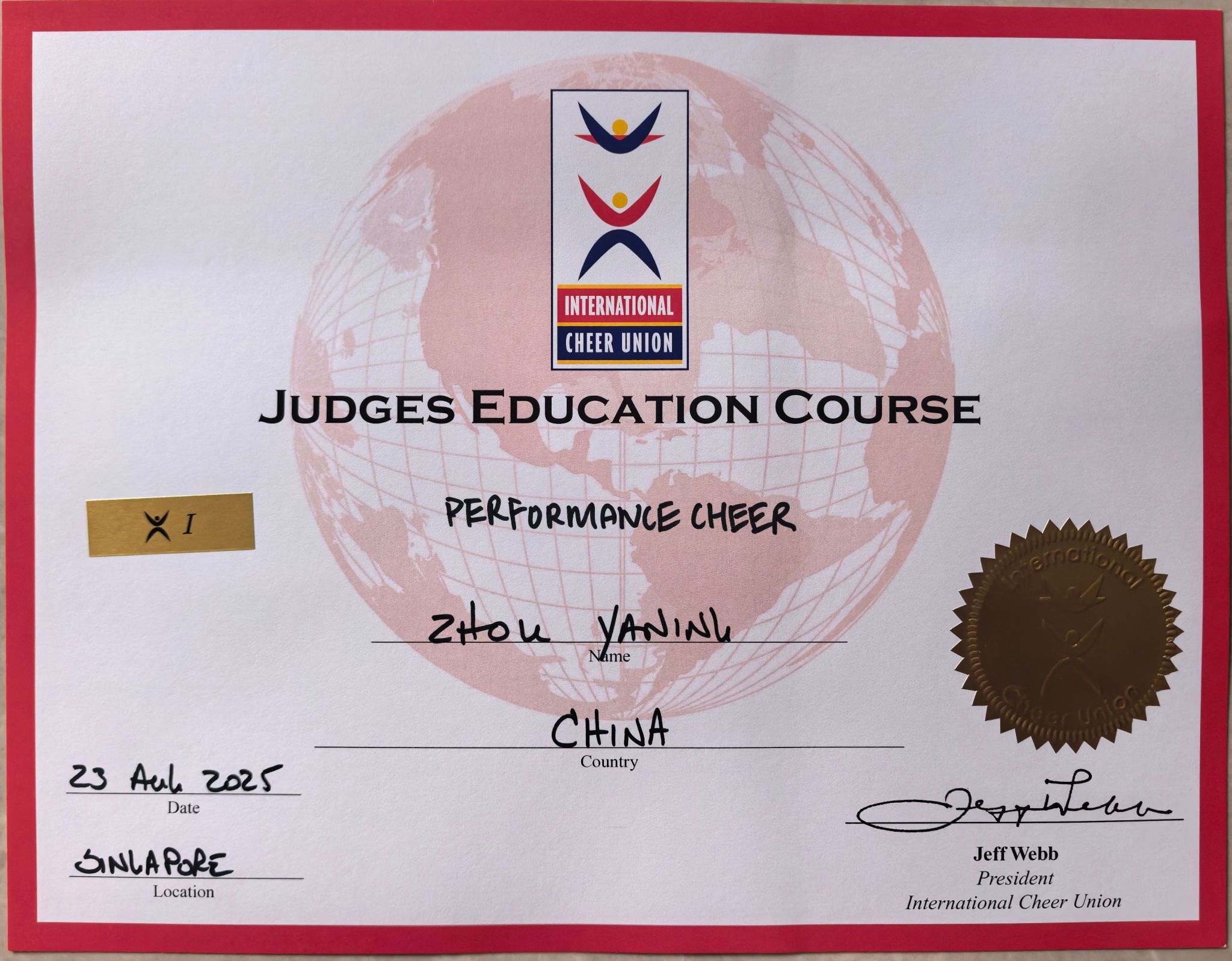 2025年8月,YABO.COM周雅宁老师赴新加坡参加由ICU国际啦啦操联盟(INTERNATIONAL CHEER UNION)举办的国际啦啦操裁判资格培训,经过严格考核,成功获得啦啦操国际级裁判员证书。此次培训汇聚全球精英,全国仅有30余名专业人士获选参与,周雅宁老师作为内蒙古自治区唯一代表,展现了卓越的专业素养与国际视野。